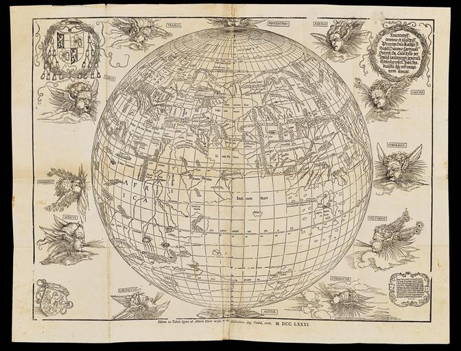 | Keywords: Stabius world map.jpg en A 1781 copy of Johann Stabius's 1515 world map whose engraving is credited to Albrecht Dürer A planisphere globe surrounded by the twelve winds equivalent to Ptolemy's third projection The arms of Matthäus Cardinal Lang von Wellenburg archbishop of Salzburg at upper left; the arms of Johann Stabius imperial astrologer at lower left Dedication to Cardinal Lang at upper right; imperial privilege and date at lower right la Reverendiss domino et illustriss Principi Dño Matheo T Angeli Diacono Cardinali Gurceñ Sa Caẽs Mtis per Italia locũtenenti generali vdño suo colen Joañ Stabius Au hãc orb imaginem dedicat Imp Caes niuus Maximilianus P F Aug Privilegio caiut nequis Libros membraenas cartas pictu'as volumĩa vel quecuqe alia que Ioan Stabius Au sub suo titulo nomie emiserit sine sua expressa voluntate In decem annis a die editioĩs sequentibus imprimat sub pena amissionis rerum impressarum decem mâcharum auri puri 1 5 1 5 Editum ex Tabula lignea ab Alberto Durer incisa quae in Bibliotheca Augustae Vindobonae extat M DCC LXXXI 1781 http //www masterart com/D C3 9CRER-Albrecht-and-BARTSCH-Adam-Von-Sammlung-verschiedener-alter-Holzschnitte-grosstentheile-nach-Albrecht-D C3 BCrers-Zeichn-PortalDefault aspx tabid 53 dealerID 19147 objectID 586474 Master Art Johann Stabius after Ptolemy al other versions <gallery> File Stabius world map II jpg </gallery> PD-old-70-1923 PD-100 1780s maps of the world 1781 maps Maps in Latin Stabius world map 1781 Adam von Bartsch |