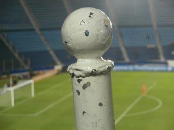 Keywords: stadium blue stadium post palo metal fierro football lawn spectators grass