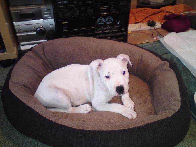 Keywords: Staffy Pup.jpg en Dizzie White English Satffordshire Bullterrier 8 weeks old own Pete2711 Staffordshire Bull Terrier puppies White dogs Dog beds