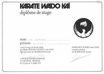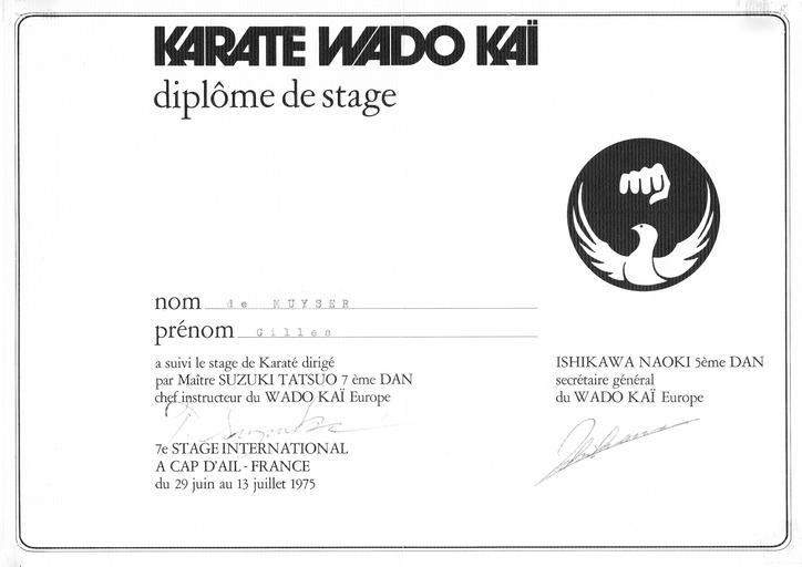 | Keywords: Stage wadokai.jpg fr 7e Stage International de Wado KaÏ Maître Suzuki effectua de nombreux stages internationaux comme en témoigne ce diplôme de fin de stage délivré en France Instructeurs Tatsuo Suzuki 7e dan Yutaka Toyama 6e dan Naoki Ishikawa 5e dan Tadayuki Maeda 5e dan Katsumi Kobayashi 4e dan Akira Mikuriya 3e dan 1975-07-13 Wado Kai Europe Tatsuo Suzuki Karate Wadō-ryū Tatsuo Suzuki Yutaka Toyama Naoki Ishikawa Uploaded with UploadWizard | ||||