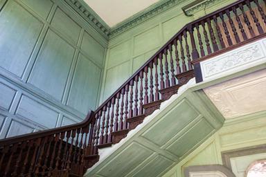 Keywords: staircase stairs railing plantation mansion architecture steps stairway climbing space history historical spindle wood panel design home house building contrast