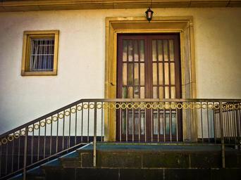 Keywords: stairs door building input gradually old house entrance front door nostalgia railing brass vintage