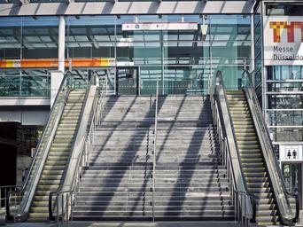 Keywords: stairs escalator gradually means of rail transport handrails architecture metal segments roller platform building city metal urban düsseldorf modern futuristic
