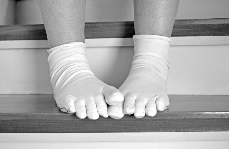 Keywords: stairs feet stand wait woman socks stockings ten upgrade get off woman foot socks with toes level stair step down wood stairs finish