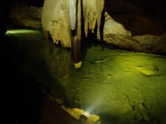 | Keywords: Stalactite and underground river.jpg The changes in colour on the main stalactite are actually optical illusions The bit that looks darker is a slightly differnt colour from the rest of the stalactite because it is wet however the submerged bit is exactly the same colour as the rest it is just all the underwater lights that make it look white When the under water lights were turned off we could see it all looked the same Also the water was suprisingly deep It doesn't look it but it is about 2m deep 2005-09-10 own assumed The bellman Diamond cave Flowstones Draperies Stalactites Underground rivers and lakes |