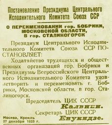 | Keywords: Stalinogorsk rename.jpg ru Постановление П езидиума Цент ального Исполнительного Комитета Союза ССР о пе еименовании го Боб ики осковской области в го Сталиного ск http //www nmosk ru/index php option com_content task view id 4512 Central Executive Committee of the Soviet Union 1933-12-27 PD-RU-exempt History of Novomoskovsk Source http //www nmosk ru/index php option com_content task view id 4512 | ||||