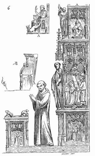 Keywords: Stalles.abbaye.Saint.Claude.Jura.2.png La figure 6 montre l'une des jouées des formes hautes et basses avec l'entrée entre elles deux Les bas-reliefs se détachent sur des fonds pleins ou ajourés; des statuettes décorent richement trop richement même ces jouées En B est tracé le profil des stalles basses Malgré la profusion des détails dans cette figure comme dans la précédente le principe de la structure de bois est toujours apparent Mais dans leurs compositions les plus riches jamais les artistes du moyen âge n'ont failli à ce principe qu'il s'agisse de la maçonnerie de la charpente de la serrurerie ou de la menuiserie Viollet-le-Duc Drawings by Eugène Viollet-le-Duc