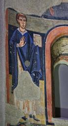 | Keywords: StaMaria Aneu MNAC-015874 0005.jpg La decoració de l ™absis de Santa Maria d ™Ã neu és una mostra de la superposició de temes i motius de l ™Antic i del Nou Testament a la pintura romà nica catalana A la volta hi ha representada l ™Epifania amb Maria en Majestat i els Mags Al registre inferior apareixen els dos serafins de la visió d ™Isaïes al temple de Jerusalem Is 6 3-6 que canten «S AN C TU S S AN C TU S S AN C TU S» i apropen les tenalles amb brases ardents als llavis dels profetes Elies i Isaïes Al mig les quatre rodes de foc del carro de Jahvè al·ludeixen a la visió d ™Ezequiel Ez 1 15 Cal subratllar també el protagonisme dels tres arcà ngels Miquel Gabriel i Rafael advocats el dia del Judici Final Aquesta original temà tica troba la seves fonts en repertoris bizantinitzants d ™Ità lia Final s XII - inici s XI Fresc 700 x 410 x 210 cm exhibition history credit line accession number 015874 own ca user amadalvarez Date 2012-07-30 10 44 58 PD-Art Apse of Santa Maria d'à neu |