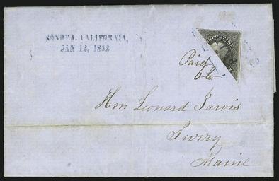 | Keywords: Stamp US 12c bisect on Sonora cover (Siegal 2004).jpg en 12c Black United States provisional or unofficial postage stamp en bisect of No 17 with a January 12 1852 Sonora California cancellation This image was uploaded from http //www siegelauctions com/dynamic/lots php year 2004 lot_name 1851-56 20Issue start_lot 243 stop_lot 266 sale_name 2004 20Rarities 20of 20the 20World sale_no 878 sale_date Saturday 20June 2012 202004; and was part of the http //siegelauctions com/ Robert A Siegel Auction Galleries Inc June 12 2004 It was described exactly as 12c Black Diagonal Half Used as 6c 17a Upper right diagonal half ample margins ideally tied across the cut by blue framed PAID straightline with matching SONORA CALIFORNIA/JAN 12 1852 two-line datestamp on blue folded letter to Surry Me from the Jarvis correspondence ms Paid 6cts slight bleaching along file fold EXTREMELY FINE AN OUTSTANDING 12-CENT 1851 BISECT COVER WITH THE RARE SONORA 1852 YEAR-DATED STRAIGHTLINE POSTMARK ONLY FIVE RECORDED COVERS -- ALL FROM THE JARVIS CORRESPONDENCE -- WITH THE 12-CENT 1851 BISECT AND SONORA STRAIGHTLINE Ex Brown Grunin and Zoellner higher resolution at http //www siegelauctions com/2004/878/266 jpg Stamp was issued in 1851 United States Post Office Department PD-USGov original upload log page en wikipedia SeigelSale_878_266 jpg 2005-06-25 05 45 WB2 506×340×8 32371 bytes <nowiki>United States unofficial bisect of No 17 with a January 12 1852 Sonora California cancellation PD-stamp This image was uploaded from http //www siegelauctions com/dynamic/lots php year 2004 lot_name 1851-56 20Issue start_lot 243 stop_lot 266 sale_name 2004 20Rarities 20of 20the 20World sale_no 878 sale_date Saturday 20June 2012 202004 and was part of the http //siegela</nowiki> 1851 stamps of the United States Postal covers of the United States Postal history of the United States Stamps on covers and postcards Bisects and splits Philatelic uploads by Ww2censor United States |