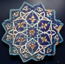 | Keywords: Star-shaped tile V&A C.747-1909.jpg Star-shaped tile with 12 points place of creation Khargird Iran circa 1444 Earthenware body under coloured glazes applied using the cuerda seca technique Diameter 40 cm Institution Victoria and Albert Museum Islamic Middle East room 42 case WE4 object history credit line Thought to have come from the west iwan of the Ghiyathiyyah madrasah built 1444 at Khargird in Khurasan Iran by the vizier of the Timurid ruler Shahrukh accession number http //collections vam ac uk/item/O108133/tile-unknown/ C 747-1909 own photo date 2015 Aa77zz artwork license PD-old-100 photo license other versions Cuerda seca ceramics Islamic art in Victoria and Albert Museum Star tiles from Iran |