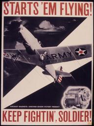 | Keywords: Start's `em flying^ Keep fightin', soldier - NARA - 534813.jpg Scope and content General notes 534813 Local identifier 179-WP-962 Office for Emergency Management War Production Board 01/1942 - 11/03/1945 Still Picture Records Section Special Media Archives Services Division NWCS-S National Archives at College Park 8601 Adelphi Road College Park MD 20740-6001 other date circa 1942 1943 Record group Record Group 179 Records of the War Production Board 1918 - 1947 Record group ARC 508 War Production Board compiled 1942 - 1943 Series ARC 533858 File unit File unit ARC Variant control numbers NAIL Control Number NWDNS-179-WP-962 Other versions <gallery> File Start's_`em_flying _Keep_fightin' _soldier_-_NARA_-_534813 tif tif File Start's_`em_flying _Keep_fightin' _soldier_-_NARA_-_534813 jpg jpg </gallery> NARA-cooperation PD-USGov World War II posters from the United States |
