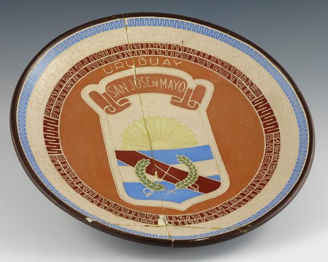 Keywords: State Gifts Plate.JPG en Ceramic concave plate displays the San Jose de Mayo coat of arms featuring the flag of Uruguay a red diagonal stripe with sabers and laurel branches superimposed on top and a rising sun Above the crest is a scroll inscribed San Jose de Mayo and the plate is encircled with three rows of decorative scroll work The back of the plate is engraved Serasconi / San Jose / Uruguay / 75 Gift of Cnel Juan J Molina Senior Intendente Municipal de San Jose Uruguay <br> Note This plate was sent to commemorate the 199th anniversary of the United States It was broken in transit from the U S Embassy in Uruguay the State Department ceramic 2 25 H x 12 Dia Institution Gerald R Ford Presidential Museum http //www fordlibrarymuseum gov/museum/ArtifactCollectionSamples/Catagories/StateGifts/Plate html Plate Uruguay accession number 1987 133 1 credit line Courtesy of the Gerald R Ford Presidential Museum Donation Date December 4 1975 Institution Institution Gerald R Ford Presidential Museum Gerald R Ford Presidential Library and Museum-cooperation PD-USGov Uploaded with UploadWizard Gifts of heads of state in the Gerald R Ford Presidential Museum Ceramic plates Commemorative plates Relations of the United States and Uruguay Coats of arms of Uruguay in art