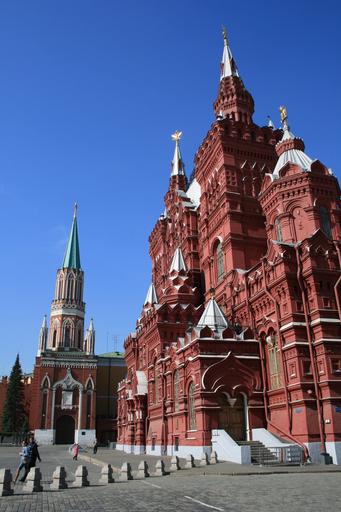 Keywords: state history museum red brick building silver roofs red square paving traffic guide stubs architecture cloudless blue sky intricately decorated building kremlin wall kremlin tower