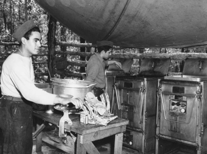 | Keywords: StateLibQld 1 100692.jpg en U S Army cooks in an Australian bush camp 1942 U S Army kitchen in an Australian bush camp One cook turns rissoles on the gas stove and the other turn the grinder affixed to the wooden kitchen table 1942-08-05 handle 10462/deriv/68894 Copied and digitised from an image appearing in the Courier-mail 5 August 1942 p 4 Contributor s Courier-mail Brisbane Qld PD-Australia StateLibQld-License World War II field kitchens Military people of Australia 1942 in Australia Black and white photographs History of Queensland/World War 2/Camp Cable Images from The Courier-Mail |