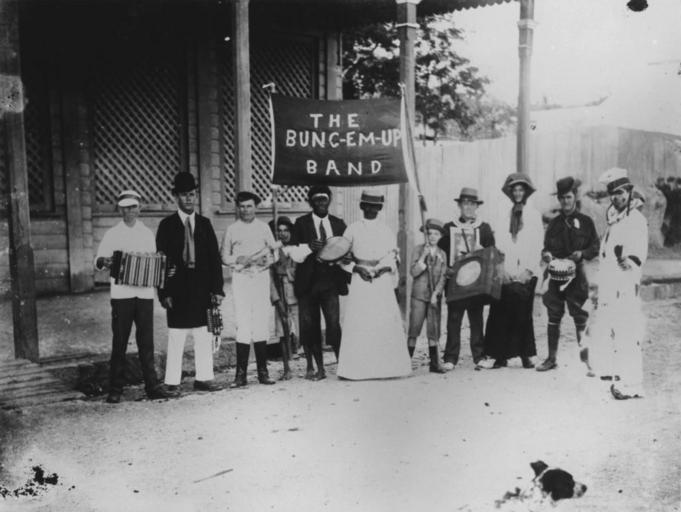 | Keywords: StateLibQld 1 100868.jpg en Bung-Em-Up Band Cooktown ca 1909 Portrait of the Bung-Em-Up Band Cooktown taken in the street in front of the verandah of a two-storey building The members are in costume and hold musical instruments including an accordion trumpet and various percussion instruments Two young boys hold a banner bearing the name of the group ~ 1909 handle 10462/deriv/69477 Item is held by John Oxley Library State Library of Queensland PD-Australia StateLibQld-License People of Cooktown Queensland |