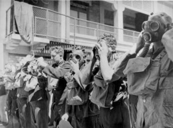 | Keywords: StateLibQld 1 107388 Demonstrators wearing gas masks at the Brisbane City Fire Brigade, Brisbane, 1942.jpg en Demonstrators wearing gas masks at the Brisbane City Fire Brigade Brisbane 1942 A training session during World War Two at the Brisbane City Fire Brigade with demonstrators wearing gas masks The men are wearing overalls and carrying bags around their necks 1942-10-17 handle 10462/deriv/91434 Item is held by John Oxley Library State Library of Queensland Contributor s Courier-mail Brisbane Qld PD-Australia StateLibQld-License Demonstrations and protests in Australia Clothing of Australia World War II home front in Brisbane 1942 in Brisbane Black and white photographs Images from The Courier-Mail |