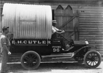 Keywords: StateLibQld 1 111620 Ford Model T truck of E. H. Cutler's plumbing service delivering a water tank, Ipswich, ca. 1914.jpg en Ford Model T truck of E H Cutler's plumbing service delivering a water tank Ipswich ca 1914 E H Cutler's plumbing service delivering a rainwater tank on their Model T Ford 10 cwt light truck about 1914 Many urban households still relied on tank water at this time E H Cutler's plumbing business then located in Boundary Street Ipswich was in operation in the Ipswich area until 1982 The front of the North American built Ford chassis is 'as delivered from the manufacturer' with no lights cab or windscreen and is typical of those produced from 1908 to 1916 The rear is fitted with a well-type utility body built by Albert Edward Roberts' Coachworks Roberts' Coachworks were located in Gordon Street Ipswich between Limestone and Brisbane Streets The main differences between the Model T truck and car chassis was the fitment of a heavy duty rear axle brakes and springs The truck rear axle used a worm drive to improve pulling power and engine braking with a choice of ratios providing maximum speeds of 15 mph for the standard ratio or 22 mph for the optional 'fast delivery' ratio circa 1914 handle 10462/deriv/130466 Item is held by John Oxley Library State Library of Queensland PD-Australia StateLibQld-License Water containers in Australia Ipswich Queensland 1914 in Queensland Black and white photographs Ford Model T