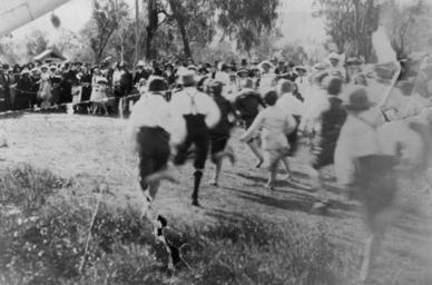 | Keywords: StateLibQld 1 111644 Children's race at Flagstone, 1910-1920.jpg en Children's race at Flagstone 1910-1920 Crowd of spectators watching a children's race in progress at Flagstone The children run towards a rope finish line held by some members of the crowd between 1910 1920 handle 10462/deriv/130688 Item is held by John Oxley Library State Library of Queensland PD-Australia StateLibQld-License Children of Queensland Athletics in Queensland Crowds in Australia Sports in Australia Recreation in Australia 1910 in Australia Black and white photographs |