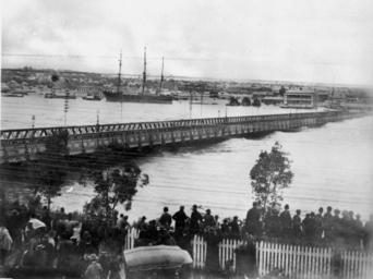 | Keywords: StateLibQld 1 114424 Victoria Bridge, Brisbane, during the 1893 flood.jpg en Victoria Bridge Brisbane during the 1893 flood A view from North Quay of the wooden Victoria Bridge Brisbane during the 1893 flood with the water almost over-running the bridge An unidentified ship is moored at South Brisbane A crowd views the scene from the bank at North Quay in the foreground 1893 handle 10462/deriv/137100 Item is held by John Oxley Library State Library of Queensland PD-Australia StateLibQld-License 1893 Brisbane flood First Victoria Bridge Brisbane Black and white photographs of bridges North Quay Brisbane |