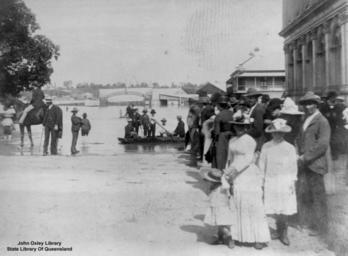 | Keywords: StateLibQld 1 116864 Flood scene at intersection Elizabeth Street and Creek Street, Brisbane.jpg en Flood scene at intersection Elizabeth Street and Creek Street Brisbane including a crowd of men women and children on the corner men in a boat and a man on a horse In the background across the water is the sign for 'Queensport Aquarium' and a part of Kangaroo Point is visible in the distance 1890 handle 10462/deriv/140075 Item is held by John Oxley Library State Library of Queensland PD-Australia StateLibQld-License Elizabeth Street Brisbane 1890 Brisbane flood Clothing of Australia 1890 in Queensland Black and white photographs |