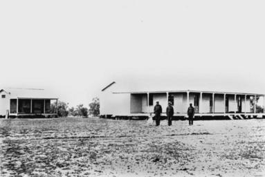 | Keywords: StateLibQld 1 122282 Three men and a child at the Surat Police Quarters, ca. 1877.jpg en Three men and a child at the Surat Police Quarters ca 1877 Three men and a child pose in the grounds of the Surat Police Quarters The men appear to be in uniform The verandahs and frontages of the two buildings are clearly visible in this image circa 1877 handle 10462/deriv/3028 Item is held by John Oxley Library State Library of Queensland Contributor s Reckitt Mills PD-Australia StateLibQld-License Police stations in Queensland 1877 in Queensland Black and white photographs Surat Queensland |