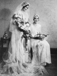 | Keywords: StateLibQld 1 127447 Cooee Blume on her wedding day, with her bridesmaid Filmer Blume.jpg en Cooee Blume on her wedding day with her bridesmaid Filmer Blume daughters of E G Blume Married P G Fegan 1931 handle 10462/deriv/82374 Item is held by John Oxley Library State Library of Queensland PD-Australia StateLibQld-License Portraits of Queensland Brides of Australia Wedding dresses in Australia Veils in Australia Bridesmaids of Australia Flower bouquets in Australia Jewellery of Australia 1931 in Australia Black and white photographs 1931 weddings 1930s wedding dresses |