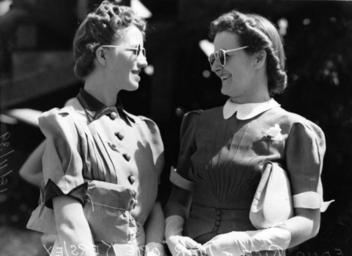 | Keywords: StateLibQld 1 128878 Edna Rice and Marjorie Kersley, Brisbane, 1939.jpg supplied with photograph The woman on the right is wearing a dress which has a pintucked bodice and contrasting upturned sleeves and Peter Pan collar The woman on the left is wearing a button-up dress also with contrasting upturned sleeves and collar Both women are wearing gloves and sunglasses and have their hair set in finger curls and rolls 1939-11-18 handle 10462/deriv/83087 Item is held by John Oxley Library State Library of Queensland Contributor s Truth Brisbane Qld PD-Australia StateLibQld-License Women's clothing of Australia People with gloves in Australia Hair fashion in Australia 1939 in Brisbane Black and white photographs Peter Pan collars Images from Sunday Truth Fashion in 1939 Sunglasses |