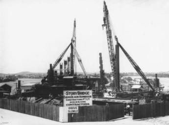 | Keywords: StateLibQld 1 129537 Story Bridge under construction, Brisbane, ca. 1936.jpg en Story Bridge under construction Brisbane ca 1936 View of the fenced-off yards of Evans Deakin-Hornibrook Constructions Pty Ltd Evans Deakin and M R Hornibrook Pty Ltd were the contractors responsible for building the Story Bridge between 1935 and 1940 On the building site cranes are being used to lift steel trusses and other materials circa 1936 handle 10462/deriv/78262 Item is held by John Oxley Library State Library of Queensland PD-Australia StateLibQld-License Workers in Australia Overhead cranes in Australia Story Bridge construction Black and white photographs |
