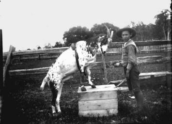| Keywords: StateLibQld 1 131131 Young boy training a goat to perform tricks.jpg en Young boy training a goat to perform tricks Young boy on a farm training a goat to perform tricks The boy wears a hat top and shorts The goat stands with its front hooves upon a box between 1900 1910 handle 10462/deriv/79987 Item is held by John Oxley Library State Library of Queensland PD-Australia StateLibQld-License 1900 in Australia Children of Queensland Children's clothing of Australia Farms in Australia Fences in Queensland Boys wearing hats Goats in Australia Boys of Australia Black and white photographs of boys Boys with animals People with goats |