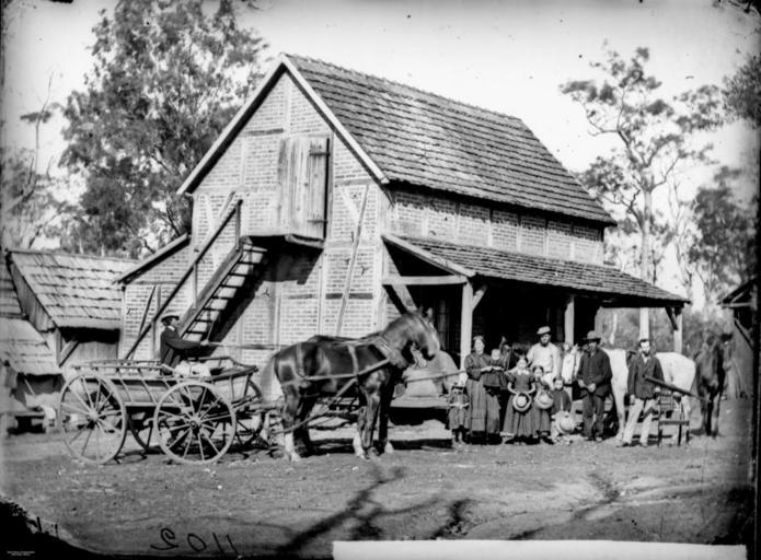 Keywords: StateLibQld 1 134905 German immigrant family on their farm, probably in the Bethania area, Logan district, 1872.jpg en German immigrant family on their farm probably in the Bethania area Logan district 1872 The early part of William Boag's career was spent in Sydney where he was in partnership with portrait photographer Joseph Charles Milligan Images made by Boag are in the collection of the Campbelltown and Airds Historical Society Boag arrived in Queensland in November 1871 He travelled around the south-east along the foreshore of Moreton Bay and the township of Cleveland He then moved into the Logan and Albert area where he captured images of local crushing mills and sugar plantations While at Yatala he took on a partner John Henry Mills and by the end of 1872 both men were in Stanthorpe where they remained for several months producing views of the booming tin-mining settlement In July 1873 after stopping off in Warwick Boag and Mills extended their operations to Mackay where they remained until October 1875 During this time Boag made trips to St Lawrence and Cooktown however his movements after this are difficult to trace It is known that by mid 1876 he was at Copperfield and Clermont and in February 1878 he inserted a notice in the Peak Downs Telegram announcing that he was leaving for the west Then information ceases abruptly It is possible that Boag never reached his destination since his death certificate records that he died in 1878 at an unknown location The first major German settlement occurred on the Logan River in 1864 when a group of 20 families of the Lutheran Free Church of Prussia established themselves on part of the extended Logan Agricultural Reserve centering on what later became the town of Bethania By 1867 two other associated settlements had been established further down the river - at 'Philadelphia' Eagleby and 'Elkana' Alberton All took up blocks of scrubland establishing farms of between 30-80 acres and turning their attention to field crops such as maize pumpkin arrowroot and potatoes Their northern European heritage was reflected in a unique type of architecture of which a good example is this half-timbered 'barn' Grain was stacked in the top storey while the farmer's family probably lived below Note the telescope displayed incongruously on a chair at far right in the photograph Boag's patrons saw his visits as a means of documenting not just their own likenesses but of affirming their place in the world by recording their most precious and personal possessions 1872 handle 10462/deriv/9496 Item is held by John Oxley Library State Library of Queensland Boag William 1838 -1878 PD-Australia StateLibQld-License Multiculturalism in Australia People of Germany Vernacular architecture of Australia Horse-drawn wagons in Queensland 1872 in Queensland Black and white photographs Half-timbered barns Barns in Australia
