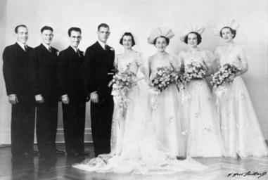 | Keywords: StateLibQld 1 138236 James Wieneke as best man at a friend's wedding, ca. 1936.jpg en James Wieneke as best man at a friend's wedding ca 1936 Inscription on back of photograph reads 'With love from Gertie Jim' James Wieneke third from the left best man in this wedding circa 1936 handle 10462/deriv/12364 Item is held by John Oxley Library State Library of Queensland Maitland H Noel PD-Australia StateLibQld-License Wedding parties Bridesmaids of Australia Wedding dresses in Australia Brides of Australia Grooms of Australia James Wieneke Weddings in Brisbane Black and white photographs |
