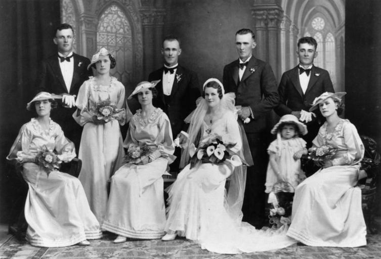 | Keywords: StateLibQld 1 140295 Portrait of a wedding party, 1930-1940.jpg en Portrait of a wedding party 1930-1940 The bride is seated and holds a bouquet She is wearing a full length wedding grown with a long trailing veil The bridesmaids are wearing long dresses carrying bouquets of flowers and wearing hats The groom best man and groomsmen are all dressed in suits and bow ties and wear a floral buttonhole A flower girl is also part of the wedding party between 1930 1940 handle 10462/deriv/19211 Item is held by John Oxley Library State Library of Queensland PD-Australia StateLibQld-License Wedding parties 1930 in Australia Portraits of Queensland Wedding ceremonies in Australia Women's clothing of Australia Flower girls Brides of Australia Grooms of Australia Flower bouquets in Australia Men's clothing of Australia Black and white photographic portraits Buttonhole flowers |
