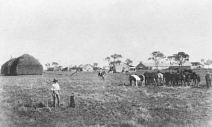 | Keywords: StateLibQld 1 151859 Country farm scene at Brenda Station, ca. 1890.jpg en Country farm scene at Brenda Station ca 1890 Two large hay stacks are on the left horses are grazing in the paddock and farm buildings are scattered in the backgound Brenda Station is in south western Queensland circa 1890 handle 10462/deriv/116733 Item is held by John Oxley Library State Library of Queensland PD-Australia StateLibQld-License Farm buildings in Australia Countryside in Australia Horses of Queensland Sheep and cattle stations in Queensland Black and white photographs |