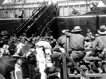 | Keywords: StateLibQld 1 158721 Soldiers boarding troopship, Brisbane, World War I.jpg en Soldiers boarding troopship Brisbane World War I circa 1914 handle 10462/deriv/7204 Item is held by John Oxley Library State Library of Queensland PD-Australia StateLibQld-License Military of Australia World War I home front in Brisbane 1914 in Queensland Australia in World War I Women's clothing of Australia Black and white photographs | ||||