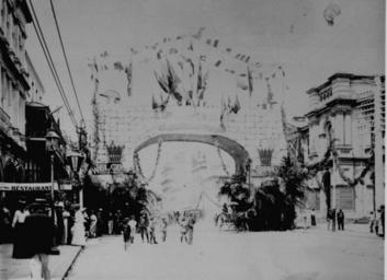 | Keywords: StateLibQld 1 160449 Federation arch in Queen street, Brisbane, 1901.jpg en Federation arch in Queen street Brisbane 1901 <br /> Street scene in Brisbane showing a view of The Queensland Naval Forces Arch This was one of five arches erected in Brisbane as a celebration of federation The Naval Arch is built to look like a stone fortress with naval guns mounted on top and above them a huge festoon of flags Midway up each side of the arch are displays made from carbines with bayonets fixed and gleaming axes with the words 'welcome to Queensland' underneath them The base of the arch is covered in tall palms and was lit at night by hundreds of flickering lamps Three arches were built in Queen street made of palm fronds and covered in greenery and were known as the Three Greenery Arches One arch was erected outside the Old Town Hall in upper Queen Street one outside the Customs House and the one we see in this photograph outside the General Post and Telegraph Office A crowd of people including children can be seen on the footpath and the street near the arch A horsedrawn carriage is passing underneath Caption 'Naval Arch Queenstreet Brisbane' 1901 handle 10462/deriv/8551 Item is held by John Oxley Library State Library of Queensland PD-Australia StateLibQld-License Queen Street Brisbane Black and white photographs Welcome arches in Queensland 1901 in Brisbane |