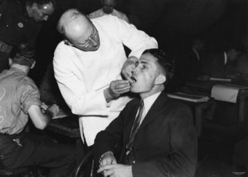 | Keywords: StateLibQld 1 164739 Dental examination during World War II.jpg en Dental examination during World War II A military recruit having his teeth checked by a dentist in Brisbane during World War II between 1939 1945 handle 10462/deriv/111271 Item is held by John Oxley Library State Library of Queensland PD-Australia StateLibQld-License World War II forces of Australia in Australia World War II home front in Brisbane Black and white photographs | ||||