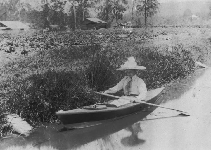 Keywords: StateLibQld 1 165295 Althea Fewings canoeing on Toowong Creek, Brisbane.jpg en Althea Fewings canoeing on Toowong Creek Brisbane Althea Fewings later Mrs Frederick Munro Hull canoeing on Toowong Creek at the bottom of Karslake residence of her parents Mr Mrs J B Fewings The Chinese market gardens are behind her and today this area is in the grounds of Toowong College off Vera Street - on the old basket ball courts circa 1900 handle 10462/deriv/111219 Item is held by John Oxley Library State Library of Queensland Hull Fred Munro PD-Australia StateLibQld-License Headgear of Australia People with hats Canoes in Australia Women's clothing of Australia Toowong Queensland Black and white photographs |