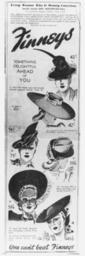 | Keywords: StateLibQld 1 165299 Advertisement for women's felt hats from Finneys' department store, 1941.jpg en Advertisement for women's felt hats from Finneys' department store 1941 Hats advertised include Navy Felt Model with coloured pheasant feather; Large Brown Felt hat with white tailored bows and bandeau; Black Model with leopard brim; Two-tone Felt in black and kasha with soft veiling; Black Felt Model designed for a Pompadour coiffure; and a Moss Green Felt hat with brown chenille veiling 1941 handle 10462/deriv/111255 Copied and digitised from an image appearing in The Telegraph 25 March 1941 p 7 Contributor s Telegraph Brisbane Qld PD-Australia StateLibQld-License Headgear of Australia Hats Women's clothing of Australia Advertisements in Australia 1941 in Queensland Black and white photographs 1941 advertisements Fashion in 1941 |