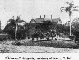 | Keywords: StateLibQld 1 167003 Gardens and residence of the Hon. J. T. Bell, Rakeevan in Graceville, 1906.jpg en Gardens and residence of the Hon J T Bell Rakeevan in Graceville 1906 In 1895 John Ferguson MLA a Rockhampton parliamentarian and a major shareholder in the Mt Morgan Mine company purchased the property In 1903 Ferguson's other daughter and her husband Joshua Thomas Bell MLA took up residence Bell from Jimbour Station held various portfolios and also served as speaker of the Legislative Assembly The Ferguson daughters established extensive tropical gardens in the grounds and in 1921 Rakeevan hosted the inaugural Sherwood Shire Agricultural Horticultural and Industrial Society Show Most of the gardens have been destroyed by subsequent development 1906 handle 10462/deriv/112196 Copied and digitised from an image appearing in the Courier Mail 23 June 1906 p 12 Contributor s Courier Mail PD-Australia StateLibQld-License Politicians of Queensland Trees in Australia Gardens in Brisbane Queensland Fences in Queensland 1906 in Brisbane Black and white photographs Houses in Graceville Queensland Images from The Courier-Mail Rakeevan |