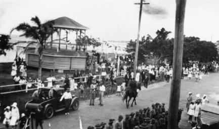| Keywords: StateLibQld 1 171811 Wynnum Central Beach Bandstand, ca. 1929.jpg en Wynnum Central Beach Bandstand ca 1929 The street scene in front of the bandstand shows people mingling with a horse and a motor vehicle Soldiers are standing in two lines in the foreground circa 1929 handle 10462/deriv/106847 Item is held by John Oxley Library State Library of Queensland PD-Australia StateLibQld-License Bandstands in Australia Vehicles in Australia Military people of Australia Wynnum Queensland 1929 in Queensland Black and white photographs |