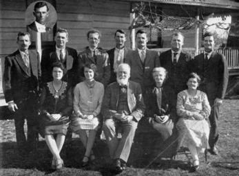| Keywords: StateLibQld 1 193403 James Dick and wife celebrate their 50th wedding anniversary, Purga, 1930.jpg en James Dick and wife celebrate their 50th wedding anniversary Purga 1930 Mr James Dick came to Queensland in 1862 when he was 19 He lived in the same house from that time until this photograph was taken Family members are sitting left to right Miss I M Dick Mrs A L Hughes Brisbane Mr and Mrs James Dick and Mrs A Cowell Manly Back row left to right Messrs R Dick John Dick Booval James Dick jun Muirlea T Dick W Dick M Dick and P Dick Inset Mr A Dick Ayr 1930-08-10 handle 10462/deriv/113664 Copied and digitised from an image appearing in The Queenslander 25 September 1930 Contributor s F A Whitehead photo PD-Australia StateLibQld-License Portraits of Queensland Architecture of Queensland Dresses in Australia Shoes of Australia Lounge suits in Australia Hair fashion in Australia 1930 in Australia Black and white photographs Images from The Queenslander |