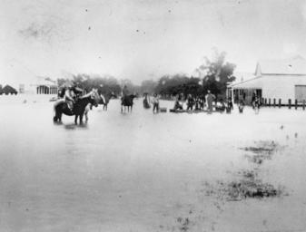 | Keywords: StateLibQld 1 193535 Floods in the town of Goondiwindi, 1890.jpg en Floods in the town of Goondiwindi 1890 Marshall street is awash with flood water forcing people to wade or ride horses after the flooding of the Macintyre River 1890 handle 10462/deriv/113931 Item is held by John Oxley Library State Library of Queensland PD-Australia StateLibQld-License Floods in Goondiwindi 1890 in Queensland Black and white photographs 1890 floods | ||||