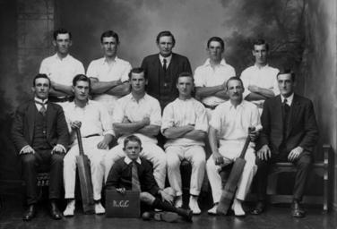 | Keywords: StateLibQld 1 198607 Unidentified men's cricket club.jpg en Unidentified men's cricket club Studio portrait of a men's cricket club A boy sits at the front holding a slate that reads 'R C C' Two of the men are holding cricket bats handle 10462/deriv/94708 Item is held by John Oxley Library State Library of Queensland Poulsen Poul C 1857-1925 PD-Australia StateLibQld-License Children of Queensland Cricket in Australia Black and white photographs | ||||