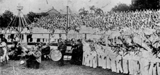 | Keywords: StateLibQld 1 200359 Children singing to the Duke and Duchess of York, Brisbane, 1901.jpg en Children singing to the Duke and Duchess of York Brisbane 1901 Children sing to the Duke and Duchess of York in the Domain Students from the Kangaroo Point Girls State School can be seen in the front row dancing on a platform around a maypole next to another group of maypole dancers Many of the boys are wearing sailor suits and are waving Australian flags or Union Jacks A band is playing in front of the platform Caption 'Five thousand children singing to the Duke and Duchess in the Domain ' 1901 handle 10462/deriv/97279 Copied and digitised from an image appearing in The Queenslander 25 May 1901 p 100 PD-Australia StateLibQld-License Children of Queensland Maypoles in Australia Sailor suits in Australia Musical groups from Australia Photographs of flags of Australia 1901 royal tour of Australia by Duke and Duchess of Cornwall and York Events in Brisbane Black and white photographs Images from The Queenslander 1901 in dance |
