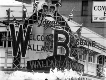 | Keywords: StateLibQld 1 213556 A Loyal Welcome to Brisbane from Wallace Bishops, February 1954.jpg en A Loyal Welcome to Brisbane from Wallace Bishops February 1954 Australian flags and Union Jacks fly from the archway of the Wallace Bishop shop decorations at the corner of Albert and Adelaide Streets Brisbane A model of the coronation crown worn by Queen Elizabeth II is at the top of the arch Coloured lights are used to highlight the display 1954-02-01 handle 10462/deriv/136130 Item is held by John Oxley Library State Library of Queensland Contributor s Queensland Newspapers Pty Ltd PD-Australia StateLibQld-License Jewellery shops in Queensland Photographs of flags of Australia 1954 royal tour of Australia by Queen Elizabeth II 1954 visit to Brisbane by Queen Elizabeth II Black and white photographs Welcome arches in Queensland |