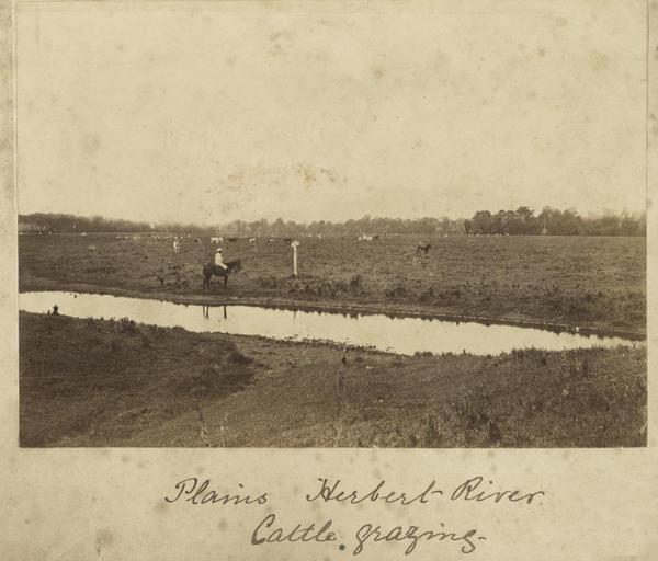 | Keywords: StateLibQld 1 235306 Cattle grazing on the plains in the Herbert River area, near Ingham, ca. 1881.jpg en Cattle grazing on the plains in the Herbert River area near Ingham ca 1881 circa 1881 handle 10462/deriv/39014 Item is held by John Oxley Library State Library of Queensland PD-Australia StateLibQld-License Views of Queensland Herbert River Cattle in Australia Horses of Queensland Ingham Queensland Black and white photographs | ||||