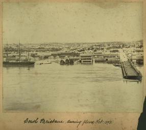 | Keywords: StateLibQld 1 256196 South Brisbane during the flood, 1893.jpg en South Brisbane during the flood 1893 February 4 1893 saw the highest floods on record in Brisbane and elsewhere; 6ft water in Edward Street at the Courier Buildings hundreds of houses washed down river trees uprooted and shipping torn from moorings The Indooroopilly Bridge was washed away and the northern end of Victoria Bridge disappeared Floodwaters rose at Brisbane to 23 feet 9 inches above mean spring tide and 10 feet over the previous highest flood mark 1890 A second flood almost reaching the level of the first was experienced on the 19th a lesser one having prevailed on the 13th South Brisbane was without fresh water for some days and the whole of Brisbane was practically in darkness at night A very large relief fund 70 000 pounds was established subscriptions in money and in kind arriving from England as well as from the other colonies Information taken from Queensland State Archives database 2004 - 2006 retrieved 11 January 2006 from <http //www archives qld gov au/exhibitions/virtualexhibition/images/1893introduction asp> 1893 handle 10462/deriv/122561 Item is held by John Oxley Library State Library of Queensland PD-Australia StateLibQld-License Ships of Australia First Victoria Bridge Brisbane 1893 Brisbane flood Black and white photographs of Australia in the 1890s Black and white photographs of Brisbane Floods in South Brisbane |