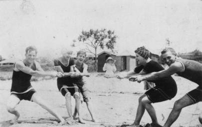 | Keywords: StateLibQld 1 388165 Beach tug of war at Southport, 1917.jpg en Beach tug of war at Southport 1917 A group of young men and women are engaged in a tug of war on the beach watched by a woman wearing a long sleeved dress and wide brimmed hat In the background wood and iron dressing sheds can be seen 1917 handle 10462/deriv/192229 Item is held by John Oxley Library State Library of Queensland PD-Australia StateLibQld-License Swimwear of Australia Beaches of Queensland Southport Queensland 1917 in Australia Black and white photographs Tug of war 1910s swimwear |