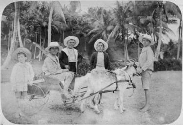 | Keywords: StateLibQld 1 392801 Small boys with a goat harnessed to a cart, Samarai, ca. 1902.jpg en Small boys with a goat harnessed to a cart Samarai ca 1902 Caption with photograph Some of the rising generation of Samarai Five small boys are pictured with the goat and cart One of the boys is sitting in the cart ready for a ride circa 1902 handle 10462/deriv/193572 Item is held by John Oxley Library State Library of Queensland PD-Australia StateLibQld-License Boys of Australia Children's clothing of Australia Goats in Australia Goat transport Samarai Black and white photographs Goat carts 1902 in Queensland 1902 photographs Goat-drawn carts in Queensland |