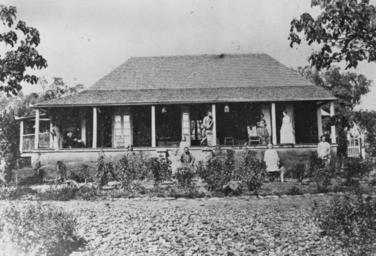 | Keywords: StateLibQld 1 393581 Homestead at St. Ruth Station, Dalby district, ca. 1875.jpg en Homestead at St Ruth Station Dalby district ca 1875 Front view of the homestead with people standing on the verandah sitting on the steps and standing in the garden circa 1875 handle 10462/deriv/193710 Item is held by John Oxley Library State Library of Queensland Contributor s Stringer R PD-Australia StateLibQld-License Sheep and cattle stations in Queensland Homesteads in Queensland Families of Australia Gardens in Queensland Colonial architecture in Australia Dalby Queensland Black and white photographs |